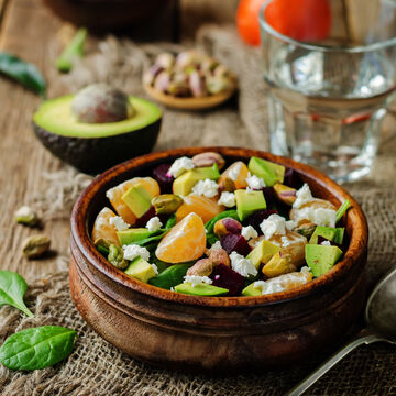 1 Couper en deux les avocats, enlever le noyau, détacher la chair et la couper en dés pas trop fins. Éplucher les mandarines et couper les tranches en morceaux. Couper en dés la betterave rouge et la feta. Laver et sécher les feuilles d'épinard. Mélanger le Mandolio, le sel, le poivre, le sucre et le jus de citron pour obtenir une vinaigrette.
