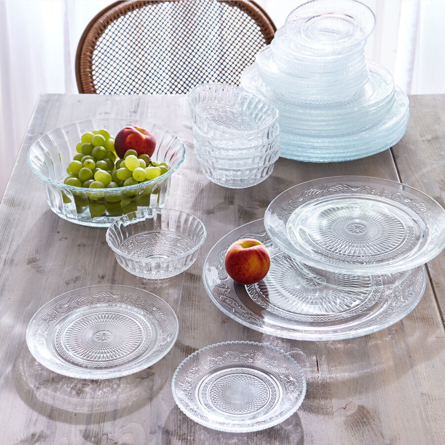 Il y a plus de 100 ans en France, ces assiettes étaient très cotées et sont maintenant des pièces de collection très recherchées. Décorées de riches dessins romantiques, elles furent produites selon la technique du verre pressé inventée en 1825 par l'Américain D. Jarves. Une manu facture de verre française a repris ces beaux dessins d'antan et relancé la production. Afin de rendre les prix accessibles, la fabrication a été déplacée en Extrême-Orient. Leur décoration de lys de la famille des Bourbons, les motifs floraux et les sarments plaisent beaucoup. Comme assiette de présentation pour vos entrées ou desserts, elles s'harmonisent particulièrement bien à d'autres vaisselles. Ces assiettes sont résistantes aux chocs et passent au lave-vaisselle.