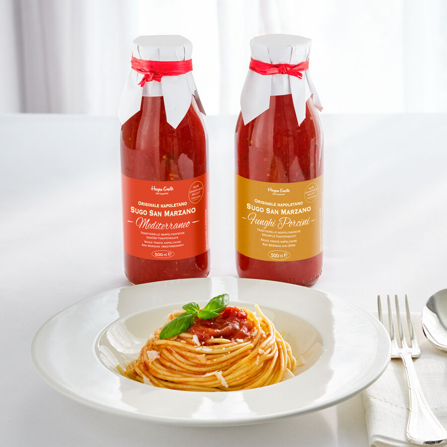 Les véritables tomates San Marzano, qui ne poussent que dans la terre fertile du pied du Vésuve, sont considérées comme les tomates les plus aromatiques d'Italie. Leur fine et incomparable saveur est, avec les tomates Roma Marzano, la base de ces sauces préparées selon une recette napolitaine originale. La sauce San Marzano Mediterraneo est une sauce tomate et légumes, affinée d'aubergine, de poivron, d'oignon, de carotte et d'ail.