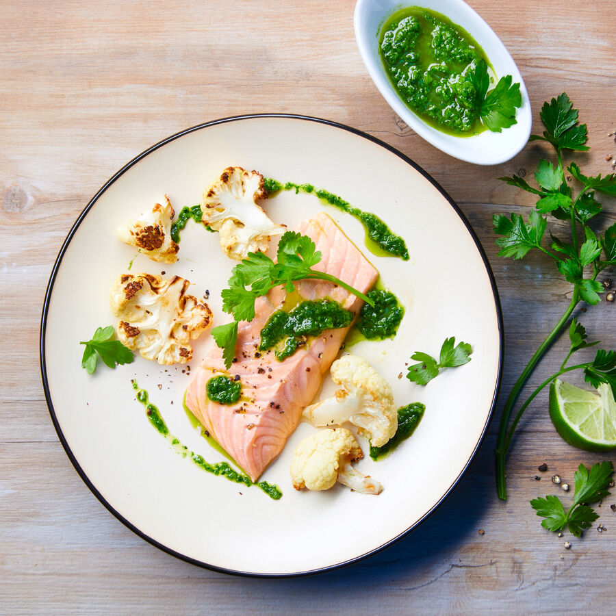 Placer le saumon poché au milieu d'une assiette préchauffée. Disposer les bouquets de chou-fleur autour. Napper le filet de saumon et le bord de l'assiette d'un peu d'huile persil-lime.