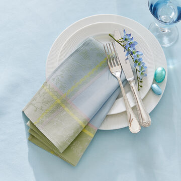 Des motifs de Pâques peints à la main constituent la base de ce linge de table en lin-coton de très haute qualité. Des lapins, oies et poules printaniers dans des tons pastel, ainsi que la surface naturellement brillante et irisée, confèrent un aspect luxueux et une charmante légèreté.