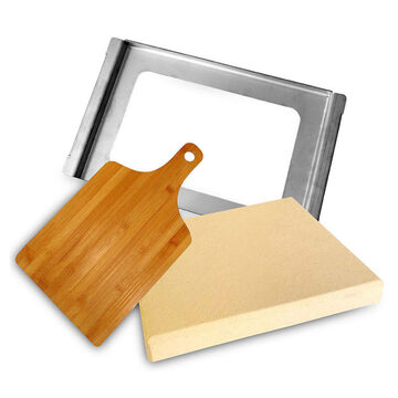 Set à pizza comprenant une pierre à pizza dans un cadre en acier inoxydable et une pelle à pizza en bois. 24 x 20 x 3 cm (l/p/h), poids 5 kg.