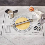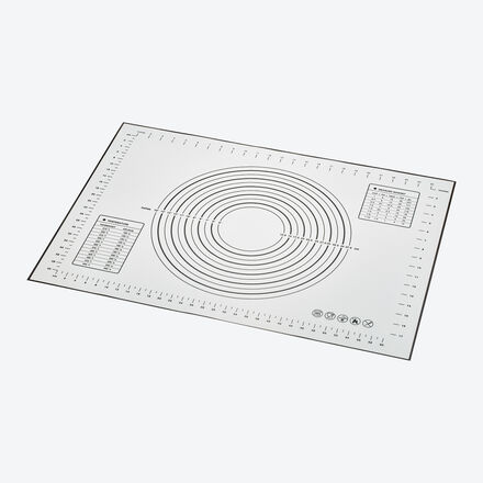 Tapis de cuisson et de travail Grâce à son effet antidérapant, permet un travail confortable et stable, protège le plan de travail des rayures et salissures. Gâteaux, pâtisseries et pizzas, toutes les étapes de préparation se font aisément : pétrir, étaler, cuire ou congeler. Graduations pratiques. Ne convient pas comme planche à découper. Peut être enroulé pour un rangement gain de place. Tapis en fibre de verre robuste, 70 x 50 cm, revêtement en silicone antiadhésif, pour températures de -40 à +230 °C, nettoyer à l'aide d'un chiffon humide.