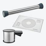 Rouleau à pâtisserie De haute qualité, permet d'étaler sans ajout de farine toutes les pâtes classiques de pâtisserie sans adhérence, y compris le massepain ou le fondant. Anneaux de silicone amovibles de réglage d'épaisseur, 2.5 mm, 5, 7 ou 10 mm. Échelle de mesure graduée jusqu'à 38 cm pour mesurer et régler la largeur de pâte. Acier inoxydable/silicone, Ø 5,5 cm, longueur 40 cm, nettoyer à l'aide d'un chiffon humide.