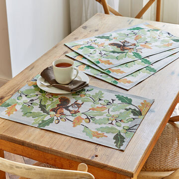 Le designer Leif Holgerson a habilement et naturellement mis en scène des feuilles de chêne et des glands d'automne avec un écureuil sur les élégants sets de table du fournisseur suédois de la cour Ekelund. Des couleurs lumineuses de « l'été indien » capturent l'automne dans toute sa beauté sur un tissu lourd et de haute qualité. Les motifs sont minutieusement travaillés dans le tissu en six couleurs selon le procédé breveté de l'arc-en-ciel, également connu sous le nom de tissage de pixels. Le résultat est un effet magnifique et des dessins brillants, comme peints.