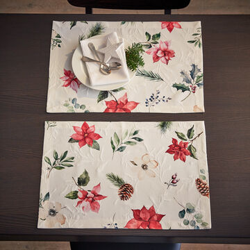 Les motifs floraux détaillés de fleurs de saison, de fruits et de pommes de pin ainsi que l'impression numérique aux couleurs intenses invitent l'hiver à votre table. Le matelassé ajoute une texture tridimensionnelle au set de table. Sur des métiers Jacquard traditionnels, la structure en relief est obtenue en utilisant plusieurs fils de trame, formant une sorte de coussin entre les tissus supérieur et inférieur. Le coton lourd protègera les surfaces fragiles.