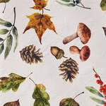 Feuilles dorées, champignons, glands et pommes de pin - l'impression numérique aux couleurs intenses reproduit les emblèmes de la belle saison d'automne. L'effet d'abondance est renforcé par l'aspect matelassé en relief du tissu. Cette structure est créée sur des métiers Jacquard classiques utilisant de multiples fils de trame. Ils forment une sorte de coussin entre le tissu supérieur et inférieur.