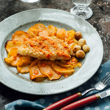 • Image du produit pour ' Skrei en croûte de noix de macadamia sur un carpaccio de patates douces avec un mojo rojo'