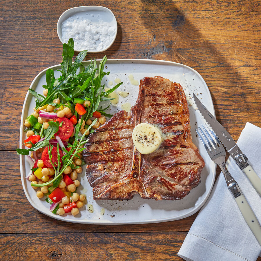 Steak T-Bone, beurre d'ail et salade de pois chiches