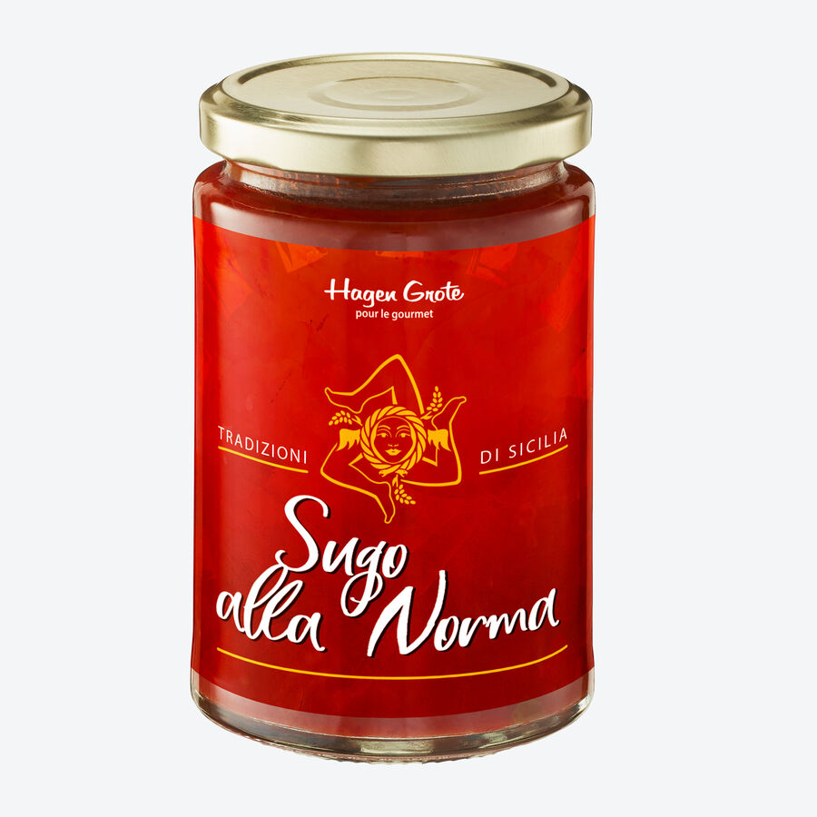 Dans les montagnes siciliennes des Madonies, des légumes au goût exceptionnel poussent à 800 mètres d'altitude sur des sols argilo-calcaires riches en potassium pour composer cette sauce. Outre les aubergines, les tomates de Siccagno, que l'on ne trouve qu'en Sicile, s'y développent. Elles développent des arômes très intenses sans aucune irrigation et à des températures estivales supérieures à 40 °C. Le Sugo alla Norma, fabriqué à partir d'aubergines fraîchement récoltées à pleine maturité, est utilisé avec des pâtes courtes (macaroni), du fromage de brebis salé ricotta ferme, des tranches d'aubergine frites très fines et du basilic pour préparer le délicieux plat typiquement sicilien, les Pasta alla Norma.