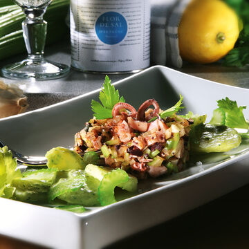 Couper les tentacules en tranches d'environ 5 mm d'épaisseur. 2 Laver le céleri, retirer les fils et le couper plusieurs fois dans le sens de la longueur. Puis couper en dés fins. Eplucher l'ail et l'oignon, dénoyauter les olives, les couper en petits dés et les ajouter aux câpres. 3 Mélanger le tout avec le poulpe. Bien assaisonner avec la fleur de sel et le paprika.
