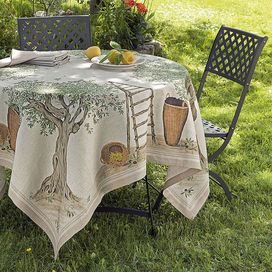 Le décor riche en détails de ce linge de table s'inspire de la cueillette d'olives traditionnelle, encore habituelle dans la région d'Apulie par exemple. Une échelle apposée contre l'arbre centenaire, sur le sol une corbeille pleine de ces délicieux fruits noirs attend déjà. Ce lin traditionnel de belle qualité (190 g/m²) confère à ce linge champêtre une élégance rustique. Au cours des années, la fibre naturelle développe un soyeux raffiné et un toucher doux. Résistante, facile d'entretien, elle dure longtemps. La fabrication traditionnelle de grande qualité assure une stabilité de la forme et une bonne tenue des couleurs. 100 % lin, lavage en machine à 60 °C.
