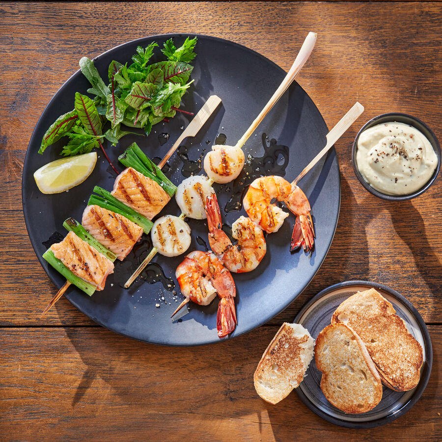 • Image du produit pour 'Trois brochettes de poissons et de fruits de mer avec aïoli'
