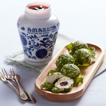 2 Prendre une boule de fromage de chèvre de la taille d'une noix dans votre main humide et presser une demi-cerise amarena en son centre. Bien enrober avec le fromage de chèvre pour former une petite boule.