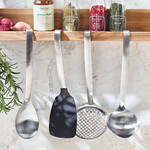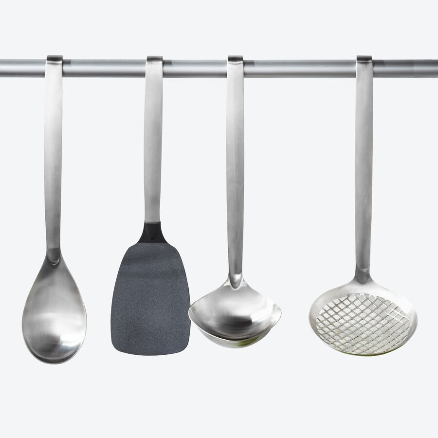 En acier inoxydable brossé de 2,5 mm d'épaisseur, poignées ergonomiques moulées en une seule pièce (sauf la spatule), indéformables, adaptées au contact alimentaire, résistantes aux acides, lavables au lave-vaisselle. Spatule de 33 cm de long, surface de retournement en nylon de 12,5 x 8,5 cm (l/p), louche de 32 x 10,5 cm (l/h), cuillère de service de 34 x 7 cm (l/h), louche de 10,5 x 7 cm, écumoire de 32 x 11,5 cm (l/h), surface d'écumage de Ø 11,5 cm.
