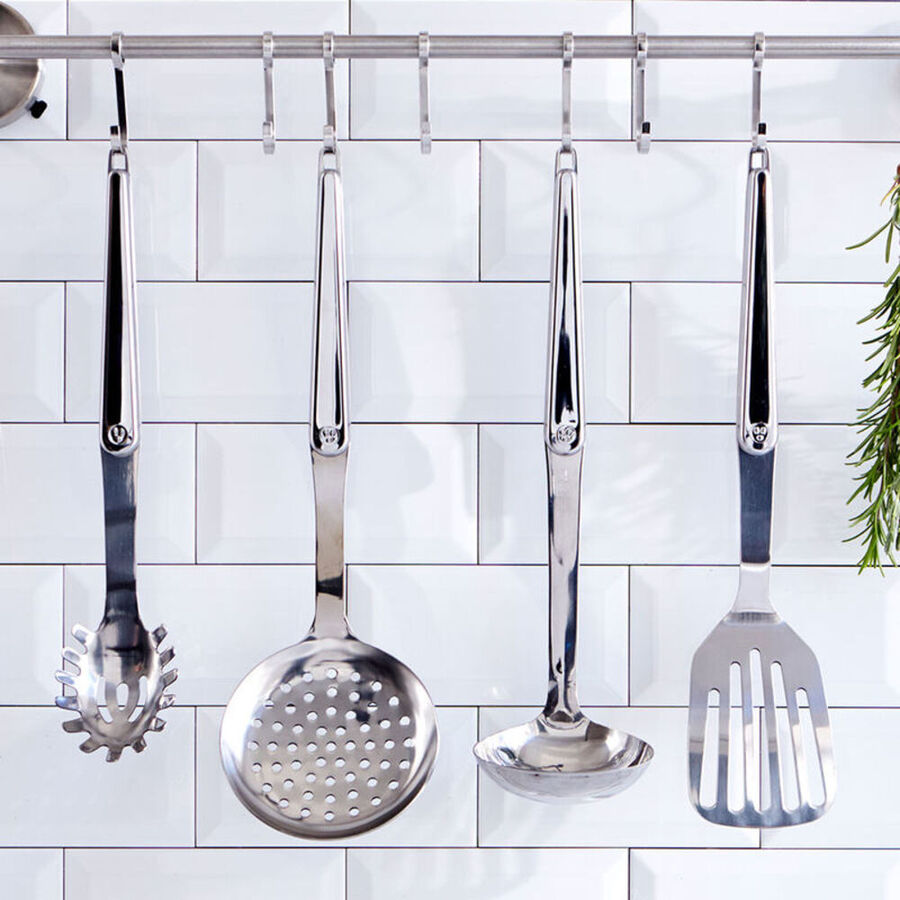 Ce set comprend une spatule, une cuillère à spaghettis, une louche et une écumoire, de 32-35 cm de longueur en acier inoxydable de grande qualité (2,5 mm) aux manches inox de forme ergonomique. Vont au lave-vaisselle.