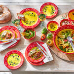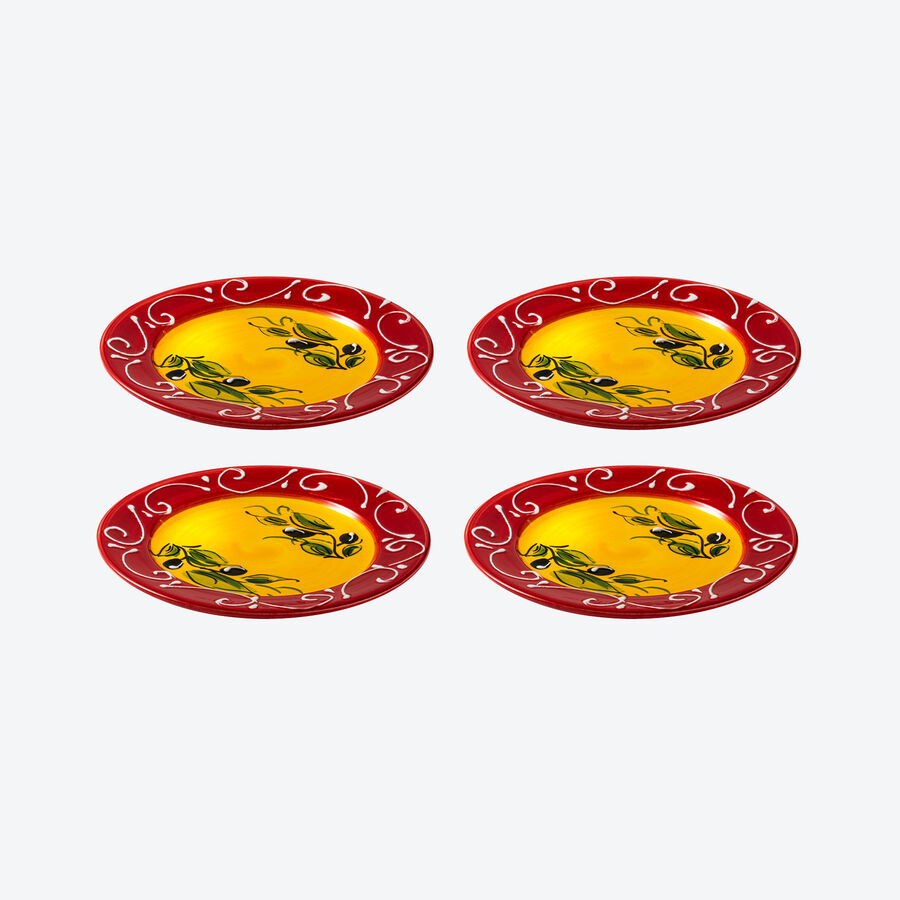 Les éléments stylistiques mauresques caractérisent encore aujourd'hui l'art et l'artisanat de cette ville autrefois arabe. Les couleurs chaudes et estivales de la vaisselle rappellent le safran et le paprika, les motifs typiques de l'olive les accompagnent à merveille. Chaque pièce est peinte individuellement à la main selon l'artisanat traditionnel. Cuite à près de 1000 °C à l'aide des procédés techniques les plus modernes, cette vaisselle en faïence robuste à glaçure alimentaire résiste aux températures jusqu'à + 180 °C, au micro-ondes et au lave-vaisselle.