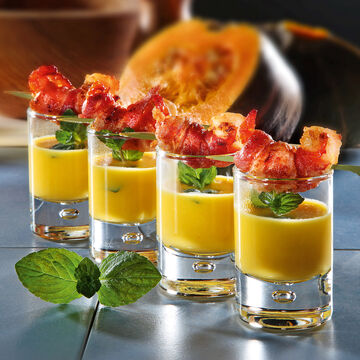 • Image du produit pour 'Velouté de potiron-fromage de chèvre avec brochettes de scampis'