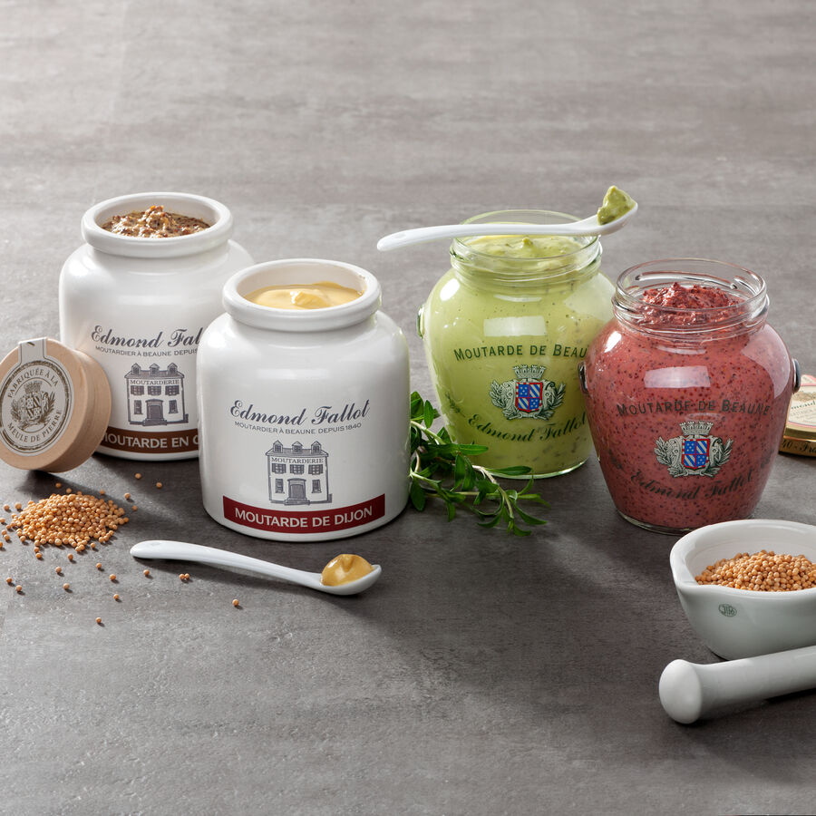 Jusqu'à il y a 100 ans, la moutarde était fabriquée partout à partir de ces graines de moutarde, qui ne peuvent pas être récoltées à la machine, mais aujourd'hui elle est presque oubliée. La véritable moutarde de Dijon ne peut être composée que de graines de moutarde récoltées à la main, de verjus (jus de fruits non mûrs), de sel, d'épices et de vin ou de vinaigre. Savourez la différence. C'est un régal d'épicer vos plats avec ce produit naturel hautement aromatique. Depuis 1840, Edmond Fallot présente sa moutarde dans le bocal classique en terre. 250 ml