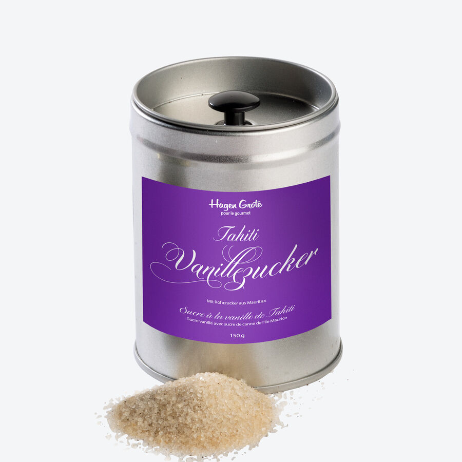 Les meilleures gousses de vanille du monde proviennent de Tahiti. La "reine de la vanille" dépasse nettement la vanille Bourbon grâce à un rendement 4 fois plus élevé, une saveur plus prononcée et un parfum floral unique! Sa chair, d'un brun foncé est particulièrement charnue, d'une saveur persistante et d'un parfum puissant. Elle mesure jusqu'à 20 cm de long. Elle est cultivée dans des petites exploitations et exige des efforts et des soins particuliers : chaque fleur est pollenisée une à une à la main. Grâce à des conditions climatiques uniques, à une culture méticuleuse et attentive, on obtient des gousses de vanille aux arômes inégalables! Contrairement au faux sucre vanillé (le produit de remplacement existe depuis 1875), ce véritable sucre vanillé est composé de 7 % de gousse de vanille de Tahiti moulue avec du sucre de canne de qualité supérieure.