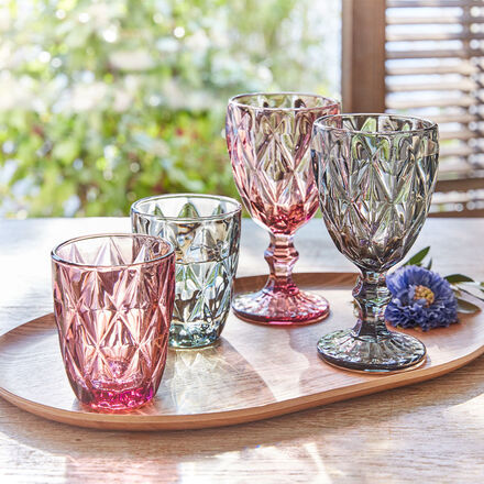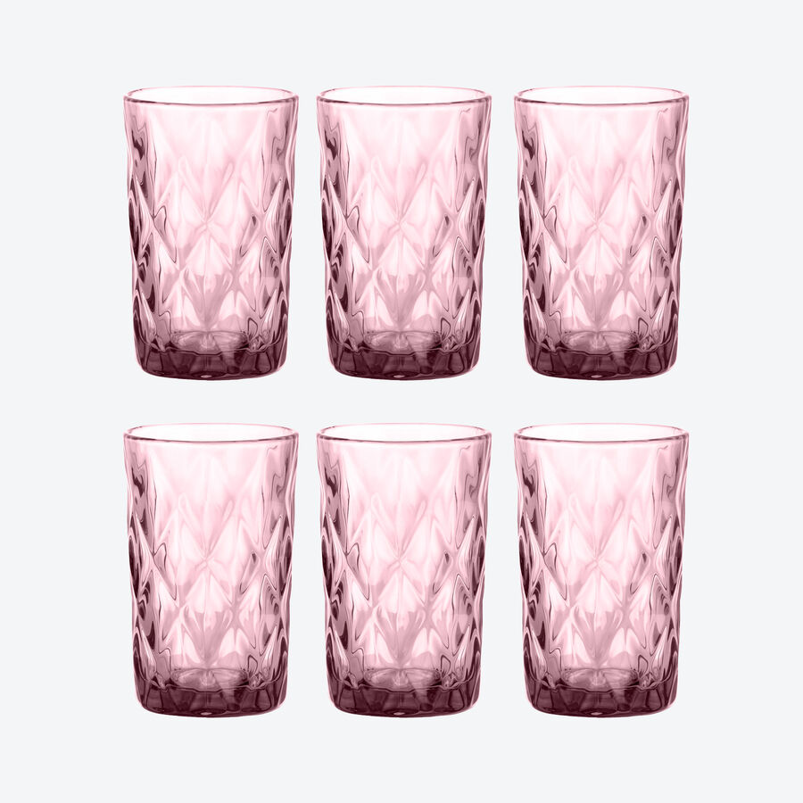 Inspirés par les couleurs de belles pierres semi-précieuses, ces verres présentent un motif de diamant, ponctué d'un subtil effet nervuré. Grâce au design original, des reflets de lumière mystiques feront scintiller vos boissons.