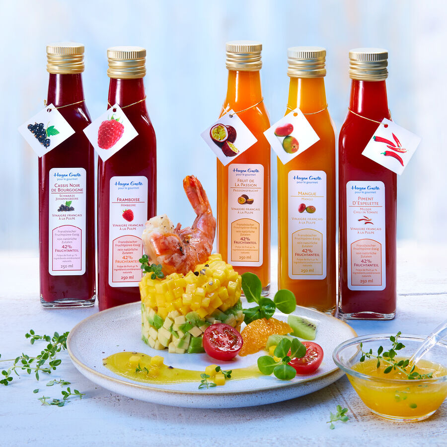 Ce condiment est constitué pour près de la moitié de pulpe pure, combinée à un vinaigre fin. Les grands cuisiniers utilisent ces vinaigres aigres-doux à la pulpe de fruit nature ou combinés à une huile fine adaptée. Les huiles de noix accompagnent parfaitement les framboises, le fruit de la passion déploie des arômes exceptionnels avec l'huile de sésame. Le piment d'Espelette piquant dans de la pulpe de tomate forme avec l'huile d'olive une relation dynamique d'acidité et de force racées. Natures ou combinés, ces vinaigres à la pulpe de fruit en tant que sauces extrêmement délicates enrichissent les salades, les légumes, la volaille, le poisson, les fruits de mer, les desserts et les fruits.