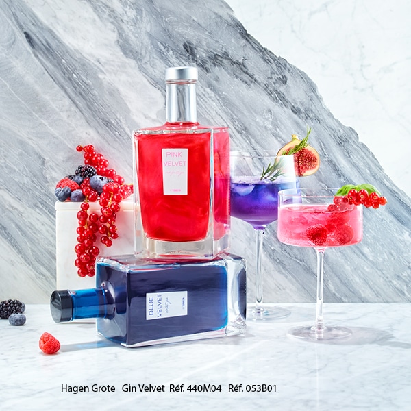 Quand il s’agit de boissons estivales, le gin ne doit pas manquer. Nos gins Pink Velvet et Blue Velvet , présentés dans des flacons décoratifs, sont un vrai régal visuel et culinaire. La particularité de ce produit : Le gin Blue Velvet passe du bleu au violet lorsqu’on lui ajoute de l’acidité, comme de l’eau tonique ou du jus de citron. Le gin Pink Velvet se met à scintiller lorsqu’on le secoue. Ces deux effets sont obtenus de manière totalement naturelle à l’aide de particules végétales.