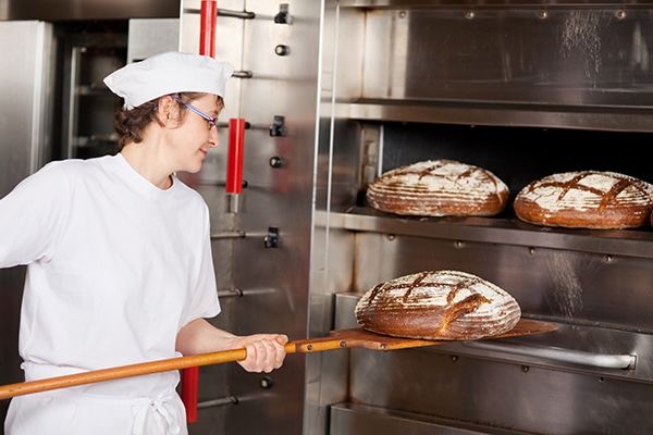 Il faut toujours préchauffer le four avant de cuire le pain. Les meilleurs résultats s’obtiennent avec la chaleur de voûte et de sole combinées, la chaleur tournante dessècherait le pain trop rapidement. Commencez par une température élevée (220-250 °C), que vous réduisez ensuite (200 °C) après un court temps de cuisson. De cette façon, le pain atteint un bon volume. Une température élevée, venant simultanément d’en haut et d’en bas, garantit que l’humidité est conservée de manière optimale dans le pain. Des plaques ou pierres de cuisson et des moules de haute qualité avec une répartition idéale de la chaleur sont importants pour obtenir un résultat uniforme. Ceux qui privilégient rapidité et facilité d’exécution auront recours à une machine à pain performante pour préparer leur pain : les ingrédients sont mélangés, la pâte pétrie, puis le pain cuit automatiquement par la machine.