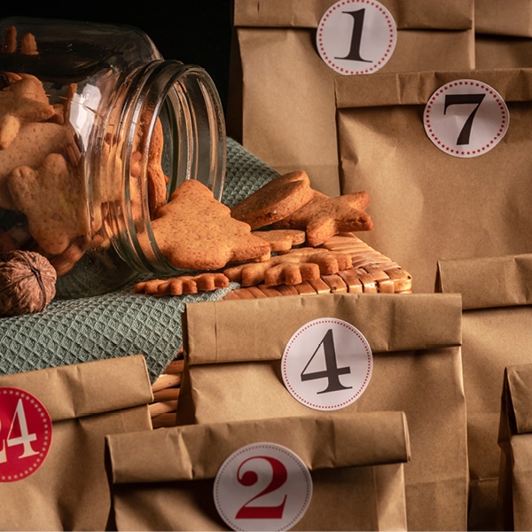Les emballages déjà numérotés sont particulièrement pratiques pour les calendriers de l’Avent. Sinon, vous pouvez utiliser des autocollants numérotés ou des pinces à linge en bois avec des numéros. Les emballages réutilisables, que l’on peut utiliser à nouveau l’année suivante, sont particulièrement durables et écologiques.