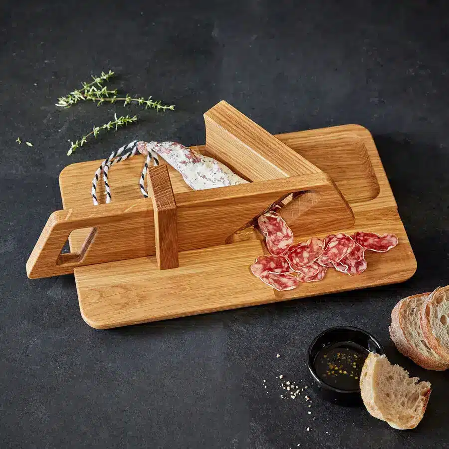 Grâce au positionnement incliné et à un affûtage innovant, la lame spéciale ultra-affûtée de la trancheuse en bois massif glisse sans effort même dans les saucisses sèches les plus dures. La lame de coupe précise et de haute qualité garantit pendant de nombreuses années des coupes fines et nettes, d’extrêmement fin à épais.
