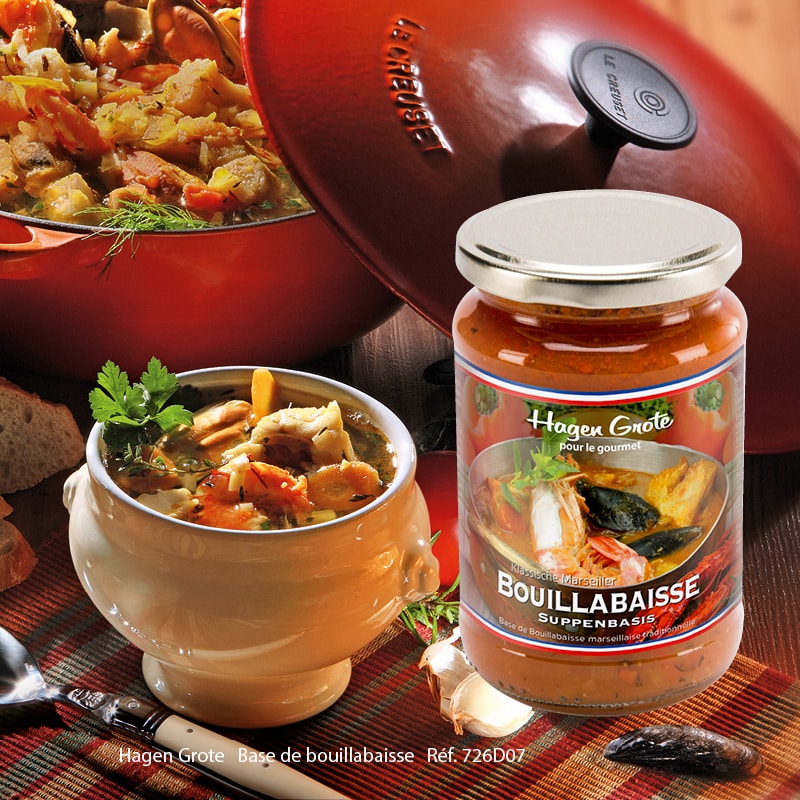 Une autre soupe de poisson typique de la Provence est la soupe de poisson à la sétoise, préparée à partir de poissons de roche aromatiques. Nous fabriquons notre soupe à la sétoise de manière artisanale selon une recette traditionnelle dans notre atelier d’épicerie fine. Grâce à sa forte teneur en poisson (52 %), elle est particulièrement aromatique. Des légumes, du vin blanc, des épices méditerranéennes et du safran viennent parfaire cette soupe savoureuse. Elle est servie de manière classique avec la rouille sétoise du sud de la France, une sauce mayonnaise-safran onctueuse qui complète à merveille les notes épicées de la soupe.
