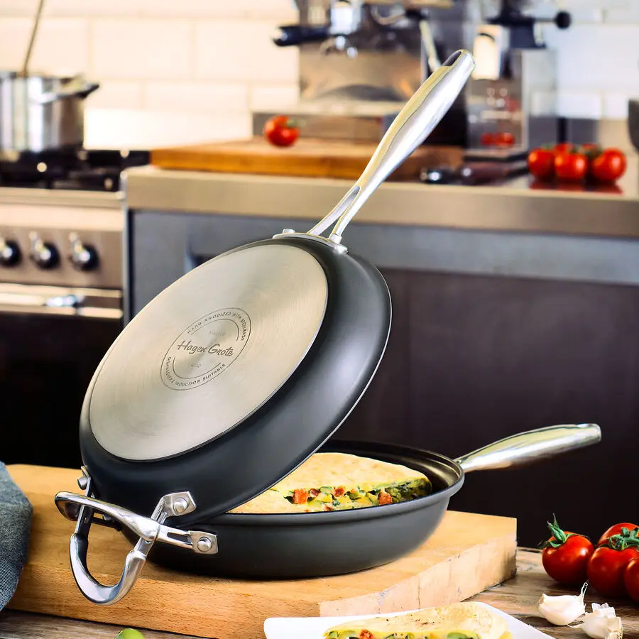 Poêle réversible pour cuire parfaitement, sur les deux faces, omelettes, frittatas, tortillas et crêpes. La poêle du dessus et celle dessous sont des poêles individuelles qui présentent toutes les qualités requises.