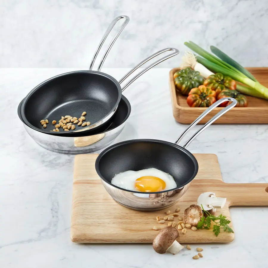 La répartition absolument uniforme de la chaleur du fond capsulé acier inoxydable/aluminium de 2,6 mm garantit les meilleurs résultats de cuisson pour les portions, petites ou moyennes.