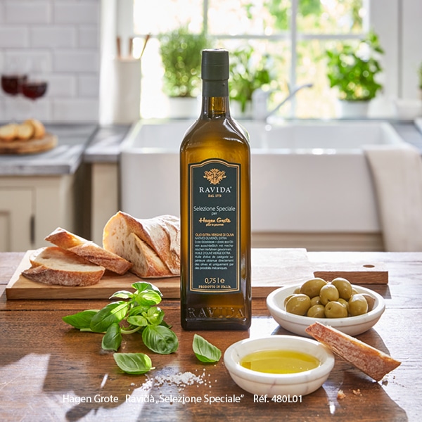 En exclusivité pour Hagen Grote, l’ huile d’olive d’Italie – Ravidà « selezione speciale » est produite à partir de 3 variétés d’olives anciennes sélectionnées. Elles poussent sur des oliviers de plus de 300 ans dans le domaine sicilien « La Gurra ». L’huile très aromatique est pressée à froid (vierge extra) le jour même de la récolte. Avec sa douceur légère et ses notes fruitées délicates, elle enrichit tous les plats de la cuisine méditerranéenne.