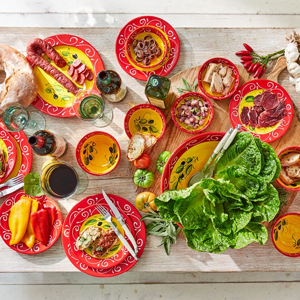 L’olivier a toujours été un symbole particulier de l’univers culinaire de la région méditerranéenne. Ses feuilles et ses fruits, reproduits fidèlement dans les différentes couleurs des niveaux de maturité, ornent cette vaisselle travaillée délicatement et artisanalement en grès cérame.