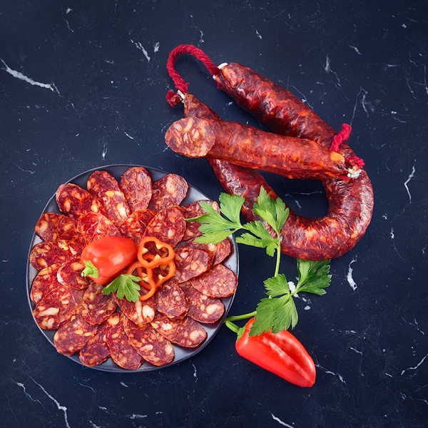 Le chorizo doux est élaboré selon une recette traditionnelle, assaisonné avec un paprika de qualité de l’Estrémadure. La belle marbrure de la viande de porc Duroc donne un saucisson goûteux, avec une légère note fumée. Parfait en fines tranches, sautée dans des sauces ou en accompagnement de plats de pommes de terre ou de haricots. Pour ceux qui préfèrent plus de piquant, notre chorizo épicé offre une saveur plus relevée au paprika.